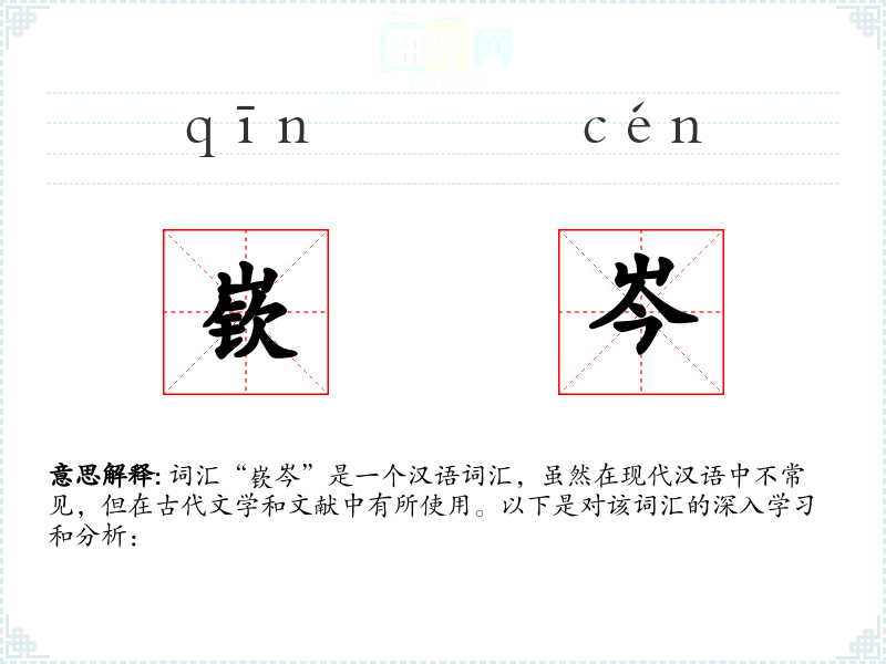 词汇“嵚岑”是一个汉语词汇,虽然在现代汉语中不常见,但在古代文学和文献中有所使用。以下是对该词汇的深入学*和分析: