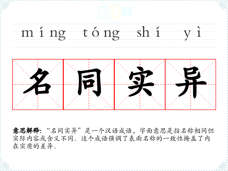 “名同实异”是一个汉语成语,字面意思是指名称相同但实际内容或含义不同。这个成语强调了表面名称的一致性掩盖了内在实质的差异。