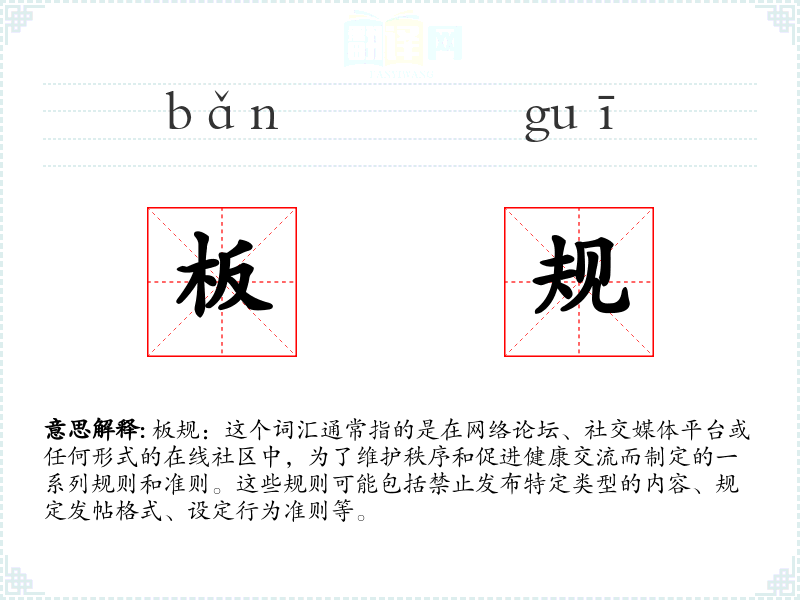 同义词:论坛规则、社区准则、发帖指南 反义词:无(因为板规是规定性的,没有直接的反义词)