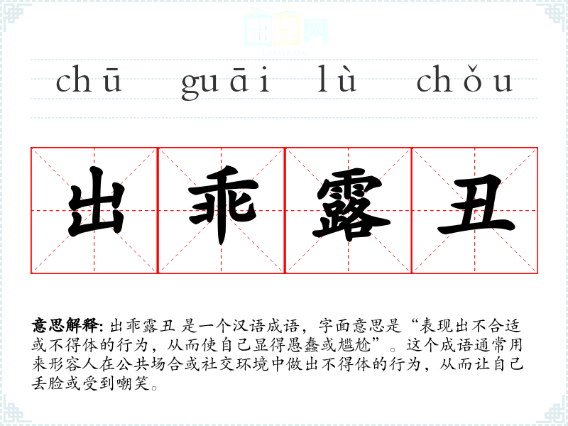 出乖露丑 是一个汉语成语,字面意思是“表现出不合适或不得体的行为,从而使自己显得愚蠢或尴尬”。这个成语通常用来形容人在公共场合或社交环境中做出不得体的行为,从而让自己丢脸或受到嘲笑。