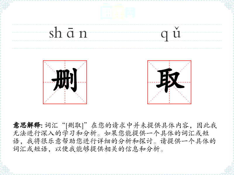 词汇“[删取]”在您的请求中并未提供具体内容,因此我无法进行深入的学习和分析。如果您能提供一个具体的词汇或短语,我将很乐意帮助您进行详细的分析和探讨。请提供一个具体的词汇或短语,以便我能够提供相关的信息和分析。