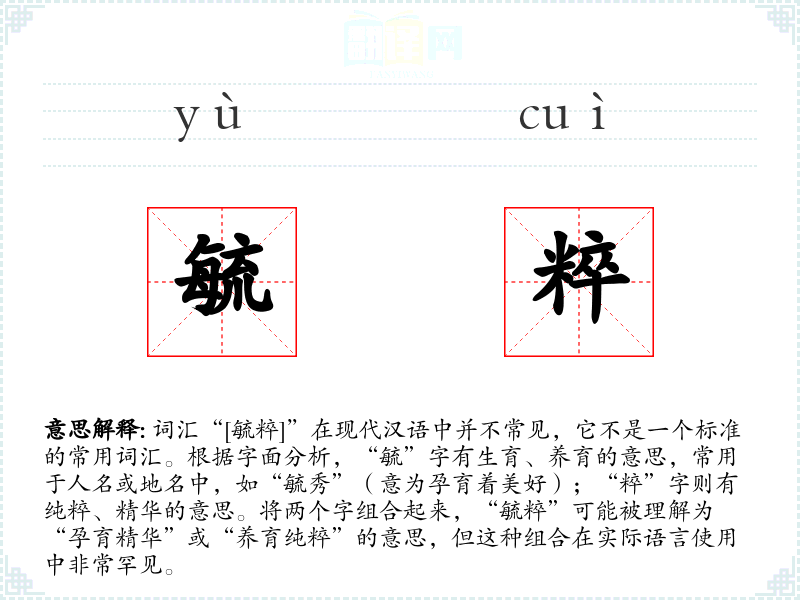 词源与演变方面,“毓”字源自古代汉语,有悠久的历史,而“粹”字同样源自古代,但在现代汉语中更多用于形容词,表示纯粹或精华。两字的组合“毓粹”在历史上并无明确记载,可能是现代创造的词汇。