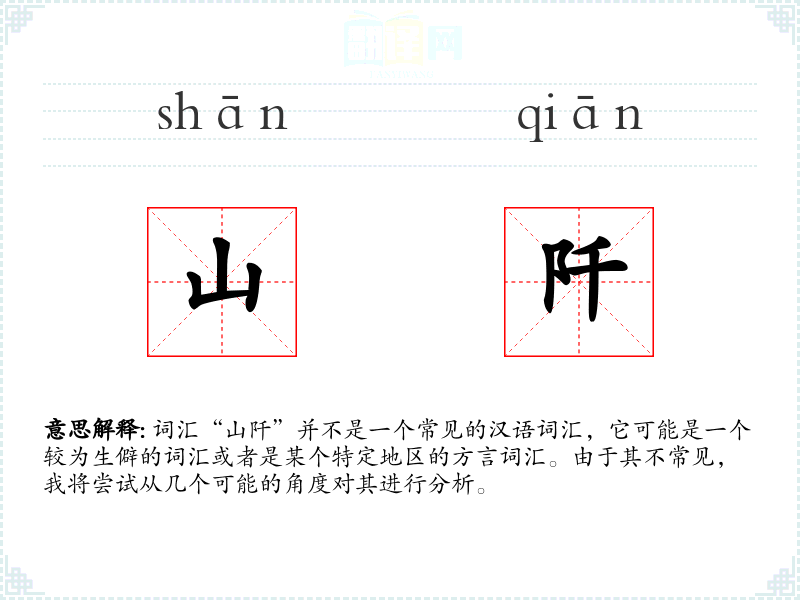 “山阡”的字面意思可能指的是山间的小路或者山脉的边缘。其中,“山”指的是自然界中的山脉,“阡”在古代汉语中指的是田间的小路,但在“山阡”这个词中,它可能被引申为山间的小径或边缘。