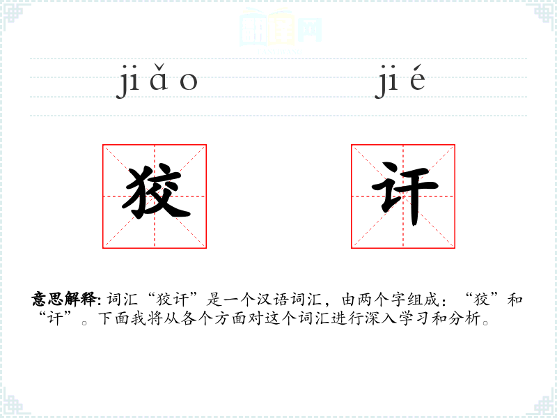 词汇“狡讦”是一个汉语词汇,由两个字组成:“狡”和“讦”。下面我将从各个方面对这个词汇进行深入学习和分析。