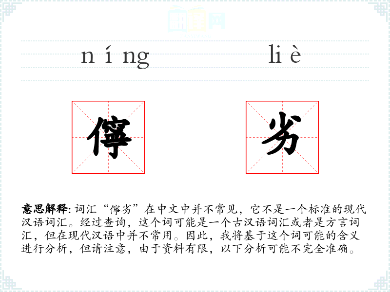 词汇“儜劣”在中文中并不常见,它不是一个标准的现代汉语词汇。经过查询,这个词可能是一个古汉语词汇或者是方言词汇,但在现代汉语中并不常用。因此,我将基于这个词可能的含义进行分析,但请注意,由于资料有限,以下分析可能不完全准确。