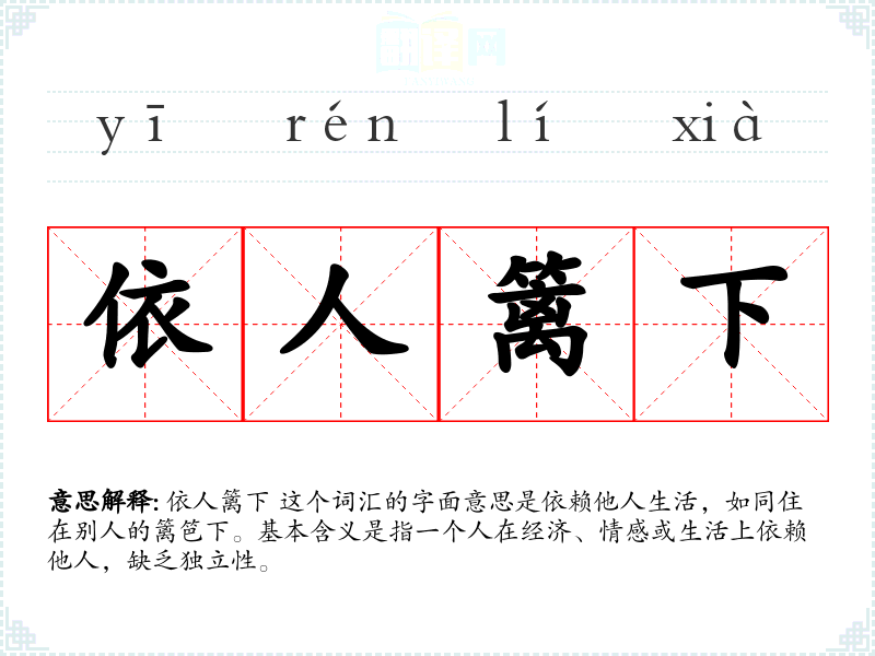 依人篱下 这个词汇的字面意思是依赖他人生活,如同住在别人的篱笆下。基本含义是指一个人在经济、情感或生活上依赖他人,缺乏独立性。