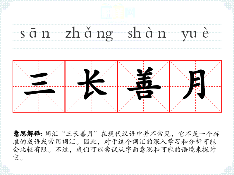 词汇“三长善月”在现代汉语中并不常见,它不是一个标准的成语或常用词汇。因此,对于这个词汇的深入学*和分析可能会比较有限。不过,我们可以尝试从字面意思和可能的语境来探讨它。