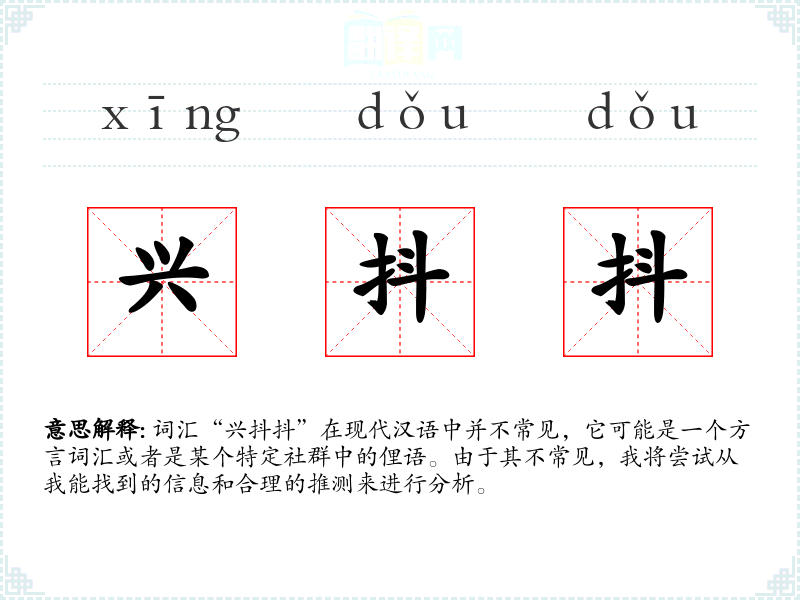 词汇“兴抖抖”在现代汉语中并不常见,它可能是一个方言词汇或者是某个特定社群中的俚语。由于其不常见,我将尝试从我能找到的信息和合理的推测来进行分析。