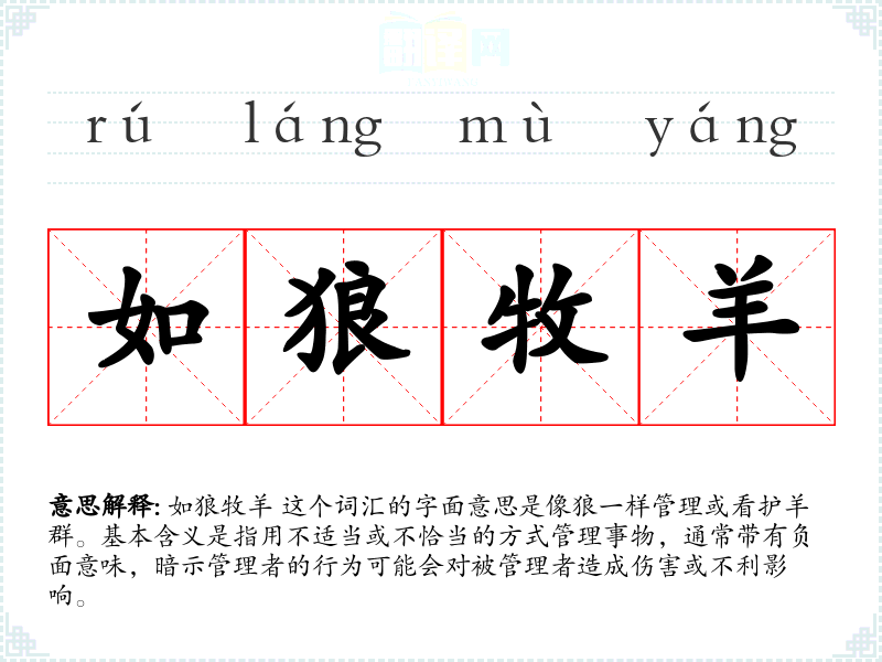 如狼牧羊 这个词汇可能源自对自然界中狼和羊关系的观察,狼通常是羊的天敌,因此用狼来比喻不恰当或有害的管理方式。在历史文献中,这个词汇常用来批评不公正的统治者或管理者。