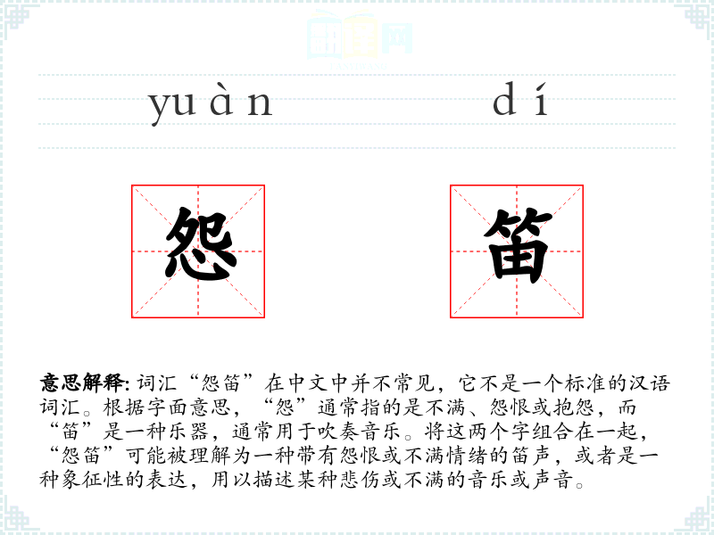 词汇“怨笛”在中文中并不常见,它不是一个标准的汉语词汇。根据字面意思,“怨”通常指的是不满、怨恨或抱怨,而“笛”是一种乐器,通常用于吹奏音乐。将这两个字组合在一起,“怨笛”可能被理解为一种带有怨恨或不满情绪的笛声,或者是一种象征性的表达,用以描述某种悲伤或不满的音乐或声音。