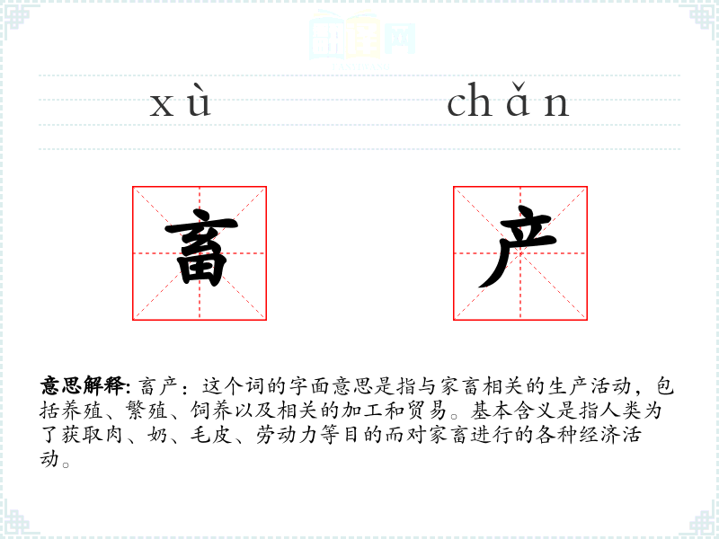 畜产:这个词的字面意思是指与家畜相关的生产活动,包括养殖、繁殖、饲养以及相关的加工和贸易。基本含义是指人类为了获取肉、奶、毛皮、劳动力等目的而对家畜进行的各种经济活动。