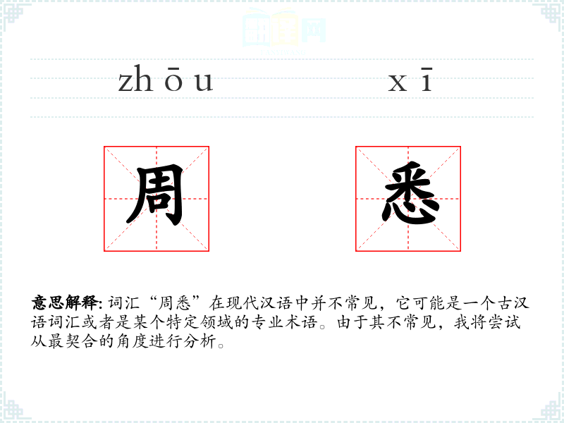 词汇“周悉”在现代汉语中并不常见,它可能是一个古汉语词汇或者是某个特定领域的专业术语。由于其不常见,我将尝试从最契合的角度进行分析。
