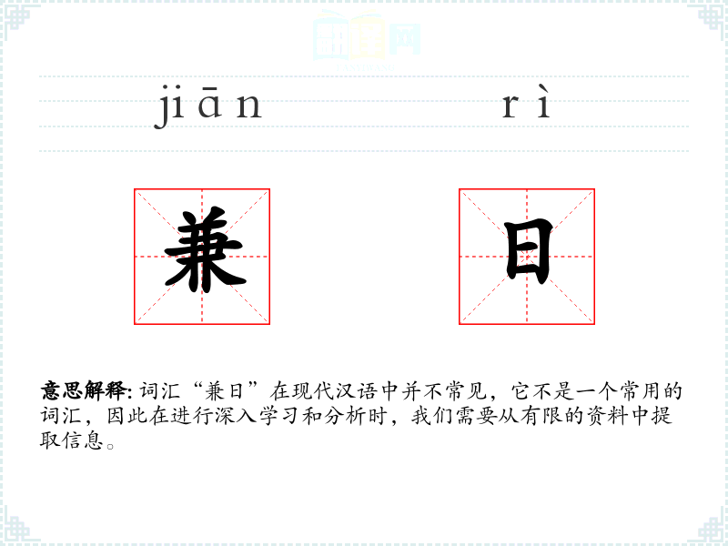 词汇“兼日”在现代汉语中并不常见,它不是一个常用的词汇,因此在进行深入学习和分析时,我们需要从有限的资料中提取信息。