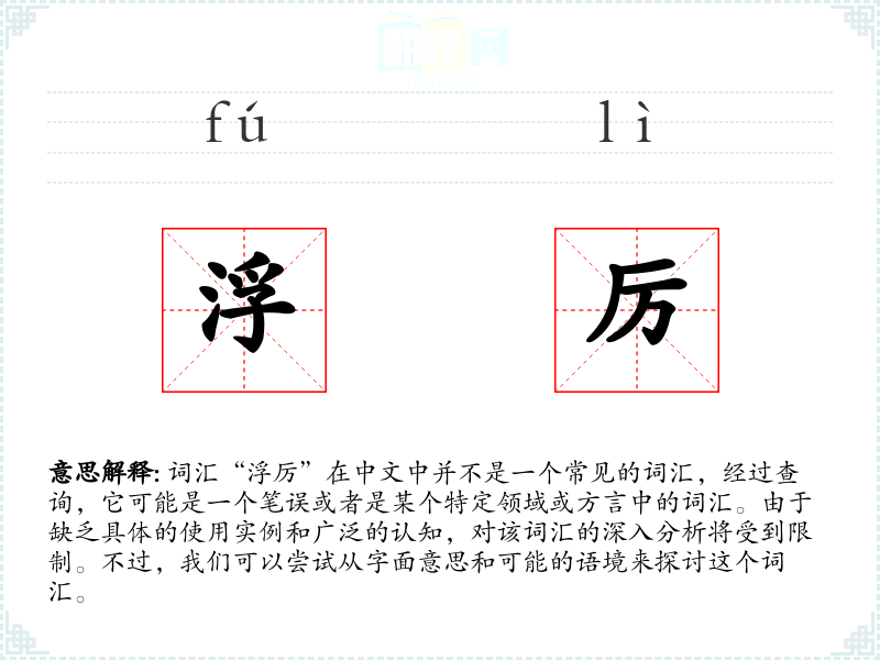 总结来说,词汇“浮厉”可能是一个特定语境下的词汇,但由于缺乏具体的使用实例和广泛的认知,对其的深入分析受到限制。在语言学习和表达中,建议使用常见且准确的词汇。