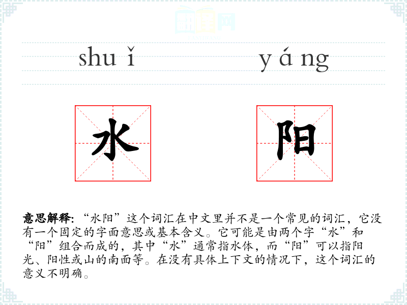 由于“水阳”不是一个国际通用的词汇,它在不同语言或文化中的对应词汇不明确。如果是一个特定地区的地名,可能在其他语言中有相应的翻译。