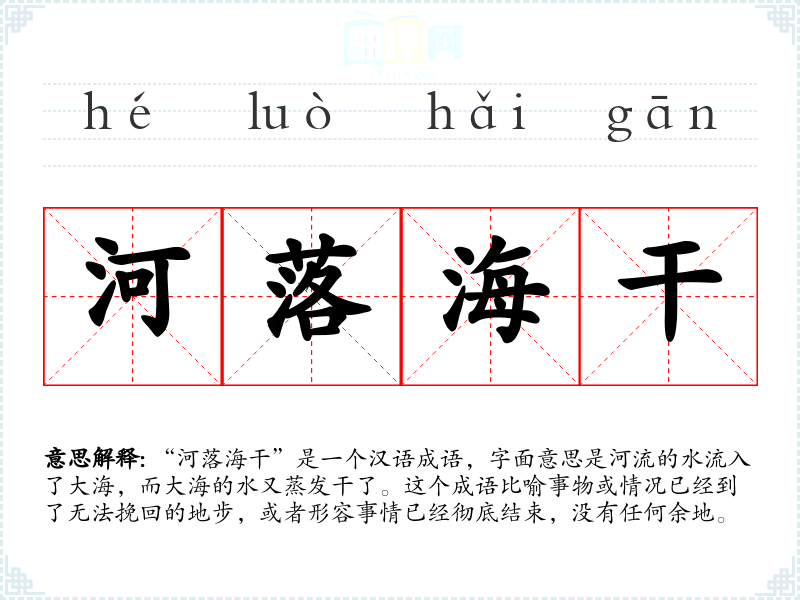 “河落海干”是一个汉语成语,字面意思是河流的水流入了大海,而大海的水又蒸发干了。这个成语比喻事物或情况已经到了无法挽回的地步,或者形容事情已经彻底结束,没有任何余地。
