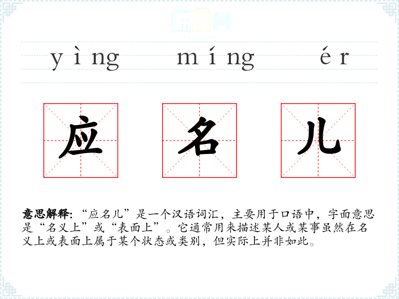 “应名儿”的词源较为直接,由“应”和“名儿”两个词组成。在古代汉语中,“应”有“符合”或“对应”的意思,“名儿”则指“名字”或“名义”。随着语言的发展,这两个词结合形成了表示“名义上”的含义。