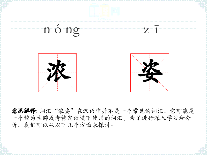 词汇“浓姿”在汉语中并不是一个常见的词汇,它可能是一个较为生僻或者特定语境下使用的词汇。为了进行深入学习和分析,我们可以从以下几个方面来探讨: