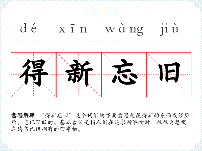 “得新忘旧”这个词汇的字面意思是获得新的东西或经历后,忘记了旧的。基本含义是指人们在追求新事物时,往往会忽视或遗忘已经拥有的旧事物。