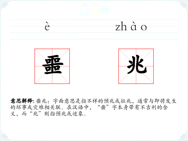 噩兆:字面意思是指不祥的预兆或征兆,通常与即将发生的坏事或灾难相关联。在汉语中,“噩”字本身带有不吉利的含义,而“兆”则指预兆或迹象。