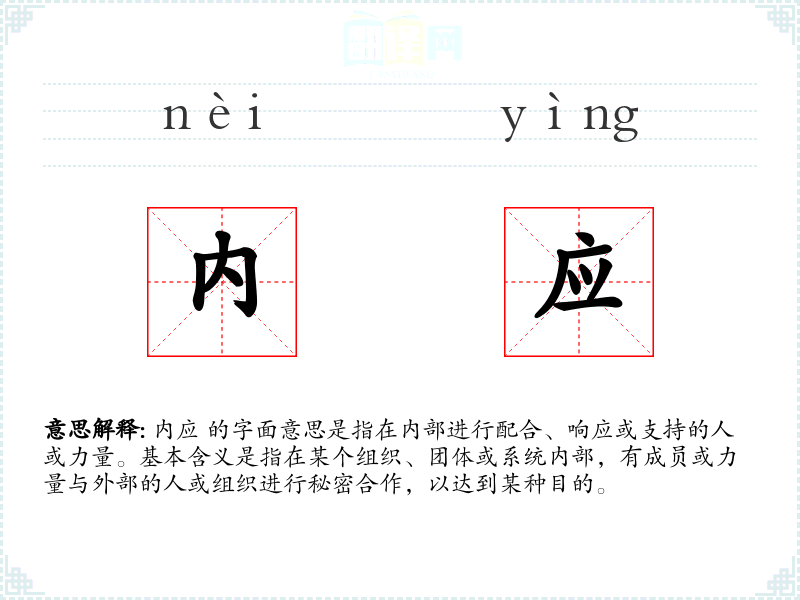 内应 一词源于汉语,由“内”和“应”两个字组成。在古代汉语中,“内”指内部,“应”指响应或配合。随着时间的推移,这个词的含义逐渐固定为在内部进行秘密合作的人或力量。
