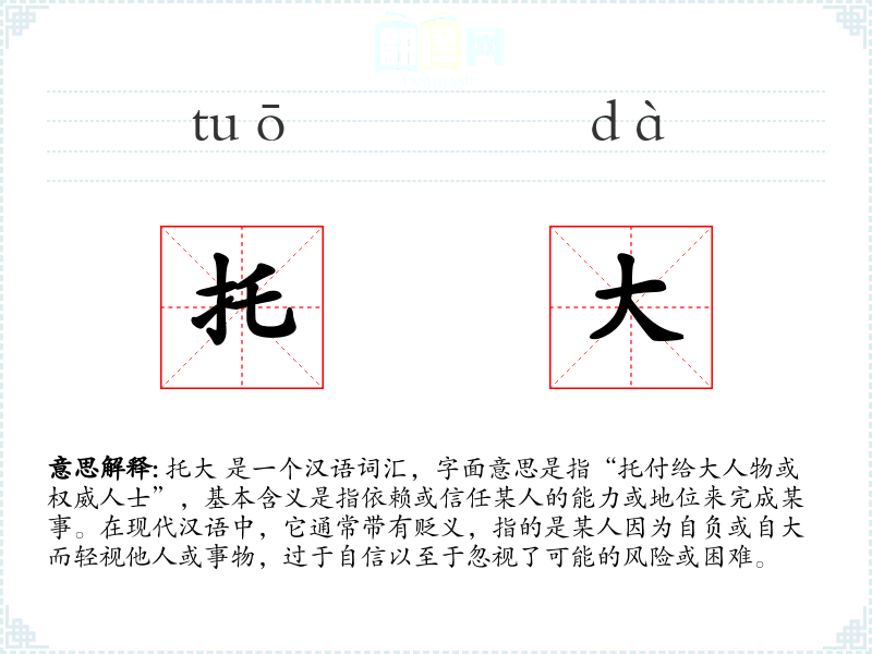 托大 是一个汉语词汇,字面意思是指“托付给大人物或权威人士”,基本含义是指依赖或信任某人的能力或地位来完成某事。在现代汉语中,它通常带有贬义,指的是某人因为自负或自大而轻视他人或事物,过于自信以至于忽视了可能的风险或困难。