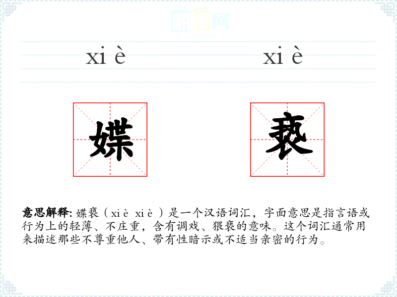 媟亵(xiè xiè)是一个汉语词汇,字面意思是指言语或行为上的轻*、不庄重,含有调戏、猥亵的意味。这个词汇通常用来描述那些不尊重他人、带有性暗示或不适当亲密的行为。