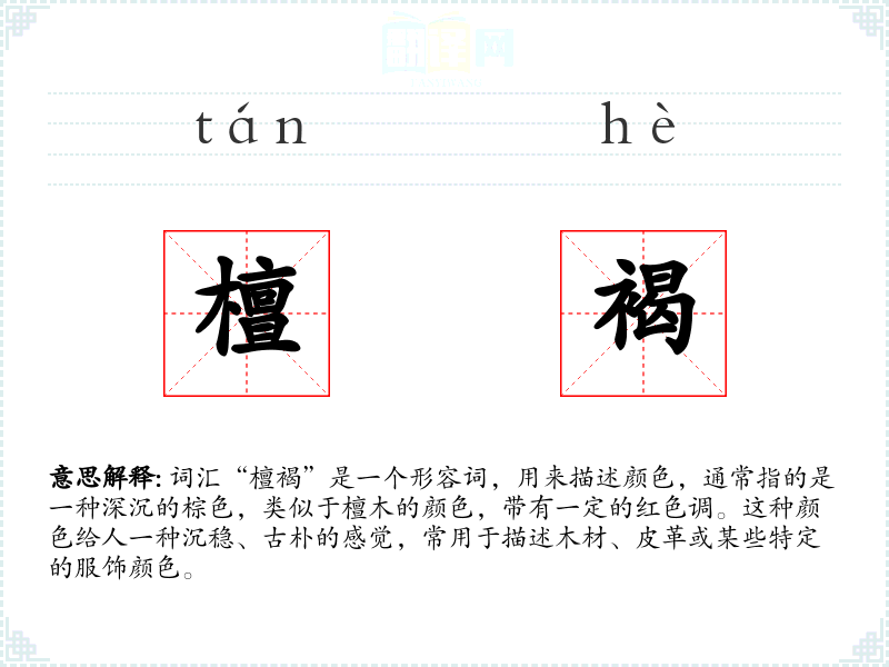 词汇“檀褐”是一个形容词,用来描述颜色,通常指的是一种深沉的棕色,类似于檀木的颜色,带有一定的红色调。这种颜色给人一种沉稳、古朴的感觉,常用于描述木材、皮革或某些特定的服饰颜色。