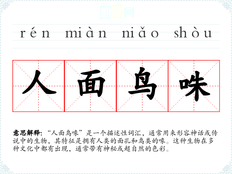 “人面鸟喙”是一个描述性词汇,通常用来形容神话或传说中的生物,其特征是拥有人类的面孔和鸟类的喙。这种生物在多种文化中都有出现,通常带有神秘或超自然的色彩。