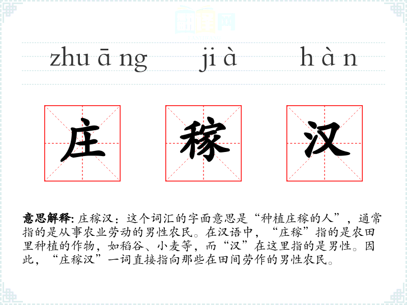 庄稼汉:这个词汇的字面意思是“种植庄稼的人”,通常指的是从事农业劳动的男性农民。在汉语中,“庄稼”指的是农田里种植的作物,如稻谷、小麦等,而“汉”在这里指的是男性。因此,“庄稼汉”一词直接指向那些在田间劳作的男性农民。