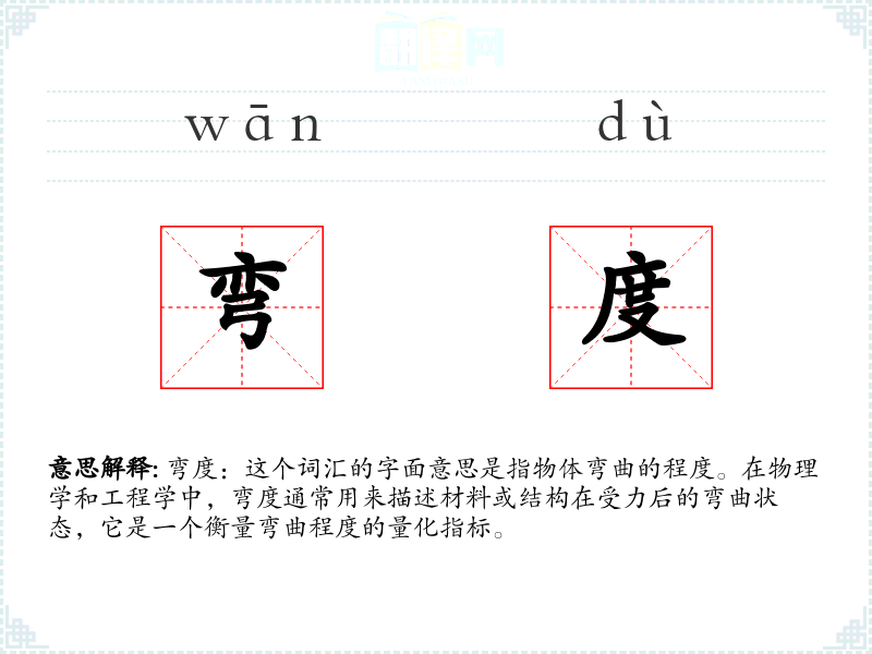 弯度:这个词汇的字面意思是指物体弯曲的程度。在物理学和工程学中,弯度通常用来描述材料或结构在受力后的弯曲状态,它是一个衡量弯曲程度的量化指标。