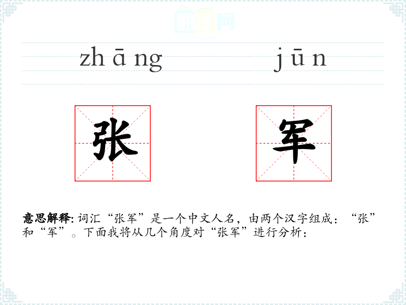 - 理解:“张军”作为一个中文人名,代表一个具体的人,可能承载着家长的期望和祝福。
