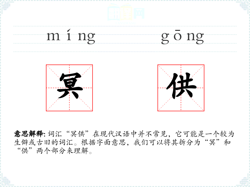 词汇“冥供”在现代汉语中并不常见,它可能是一个较为生僻或古旧的词汇。根据字面意思,我们可以将其拆分为“冥”和“供”两个部分来理解。