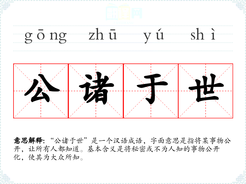 “公诸于世”是一个汉语成语,字面意思是指将某事物公开,让所有人都知道。基本含义是将秘密或不为人知的事物公开化,使其为大众所知。