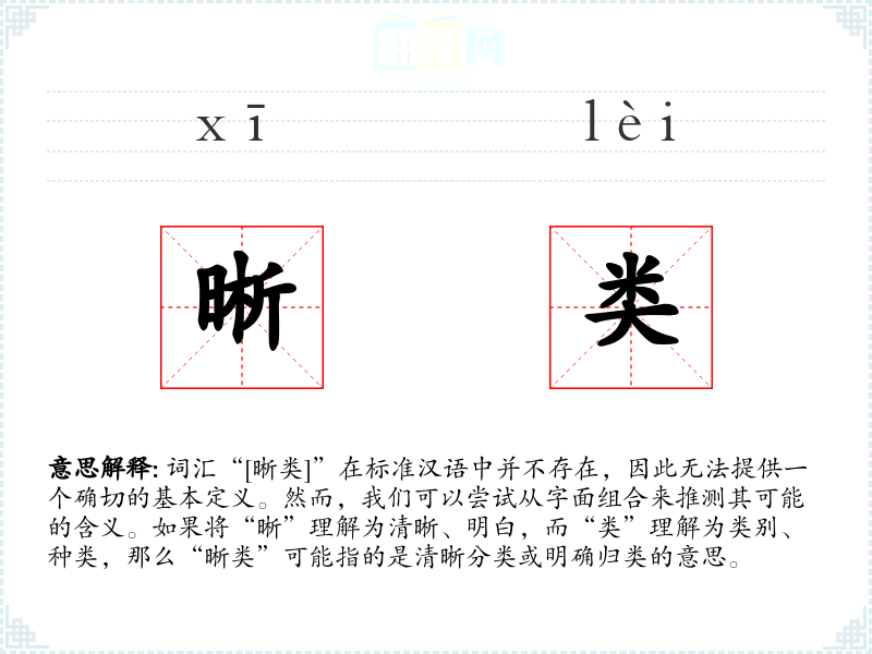 词汇“[晰类]”在标准汉语中并不存在,因此无法提供一个确切的基本定义。然而,我们可以尝试从字面组合来推测其可能的含义。如果将“晰”理解为清晰、明白,而“类”理解为类别、种类,那么“晰类”可能指的是清晰分类或明确归类的意思。