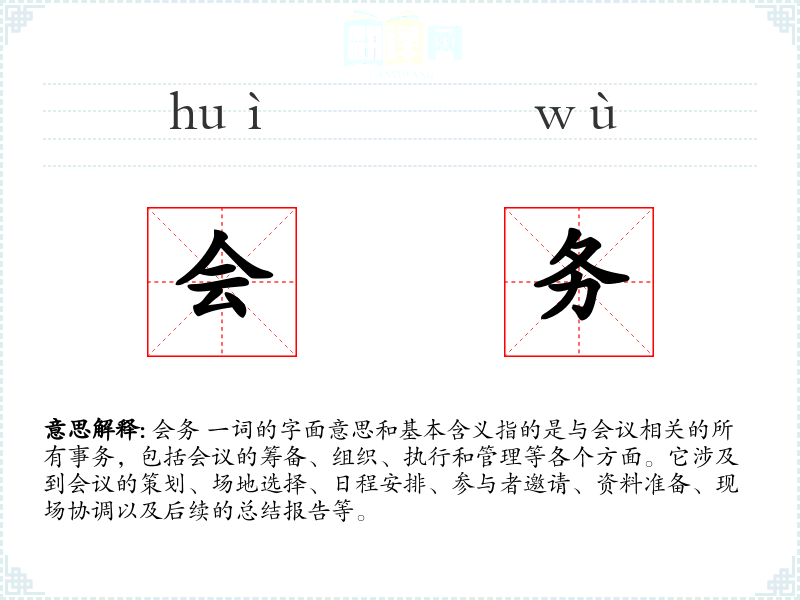 - 反义词:无(因为“会务”是一个特定领域的术语,没有直接的反义词)