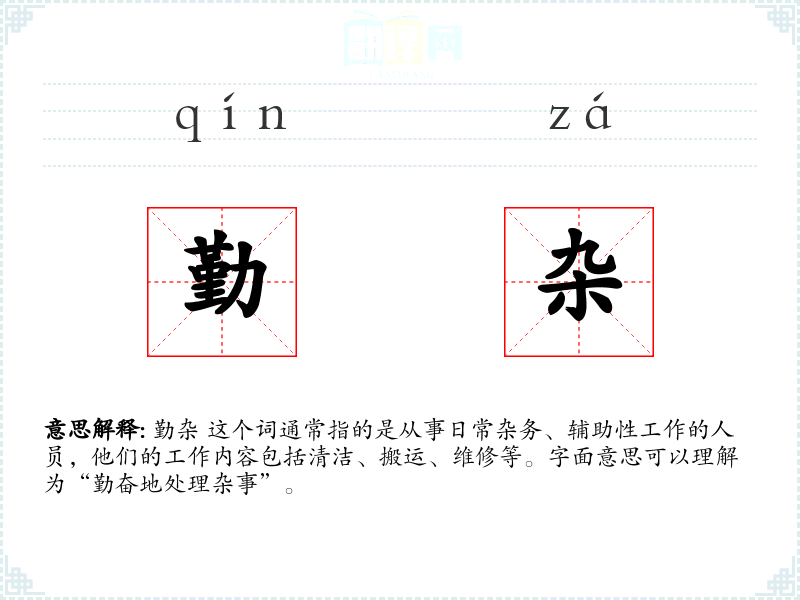 勤杂 这个词由“勤”和“杂”两个字组成,其中“勤”表示勤奋、勤劳,“杂”表示杂乱、杂事。这个词在中文中历史悠久,但随着社会分工的细化,其含义和使用场景也有所变化。