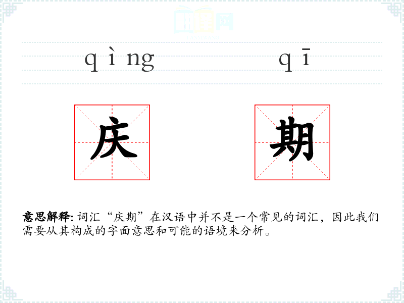 词汇“庆期”在汉语中并不是一个常见的词汇,因此我们需要从其构成的字面意思和可能的语境来分析。