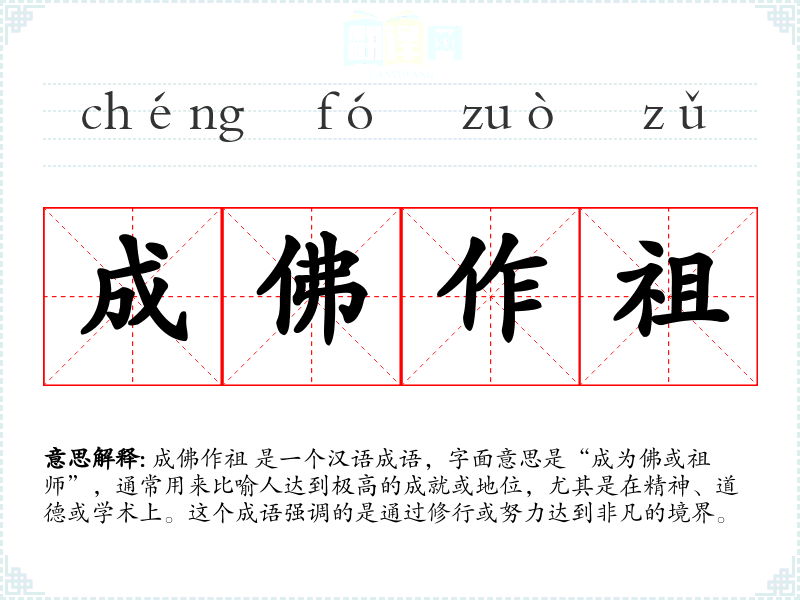 成佛作祖 是一个汉语成语,字面意思是“成为佛或祖师”,通常用来比喻人达到极高的成就或地位,尤其是在精神、道德或学术上。这个成语强调的是通过修行或努力达到非凡的境界。