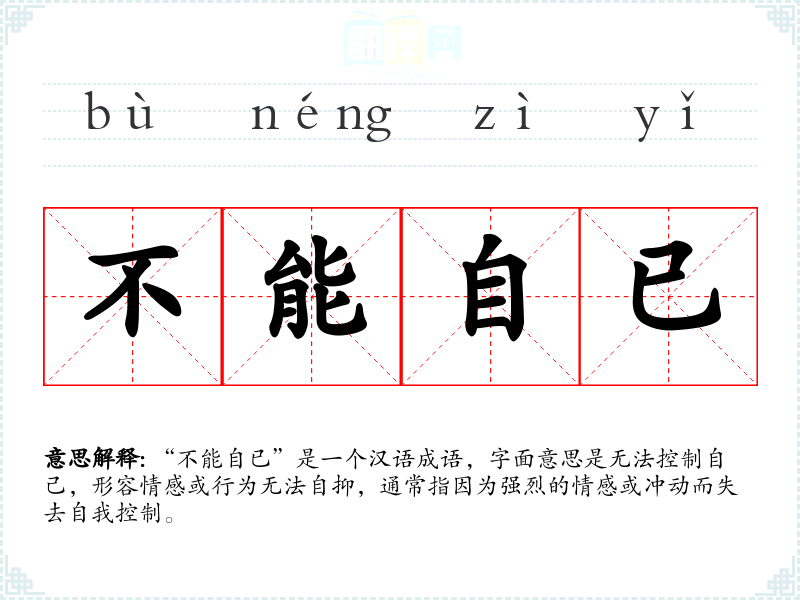 “不能自已”是一个汉语成语,字面意思是无法控制自己,形容情感或行为无法自抑,通常指因为强烈的情感或冲动而失去自我控制。