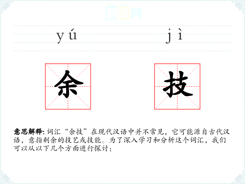 词汇“余技”在现代汉语中并不常见,它可能源自古代汉语,意指剩余的技艺或技能。为了深入学*和分析这个词汇,我们可以从以下几个方面进行探讨: