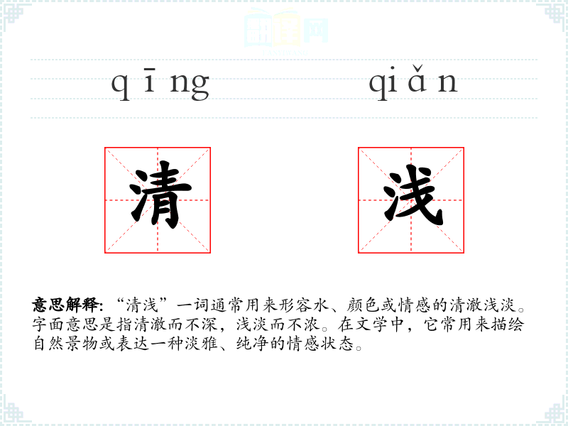 “清浅”一词通常用来形容水、颜色或情感的清澈浅淡。字面意思是指清澈而不深,浅淡而不浓。在文学中,它常用来描绘自然景物或表达一种淡雅、纯净的情感状态。