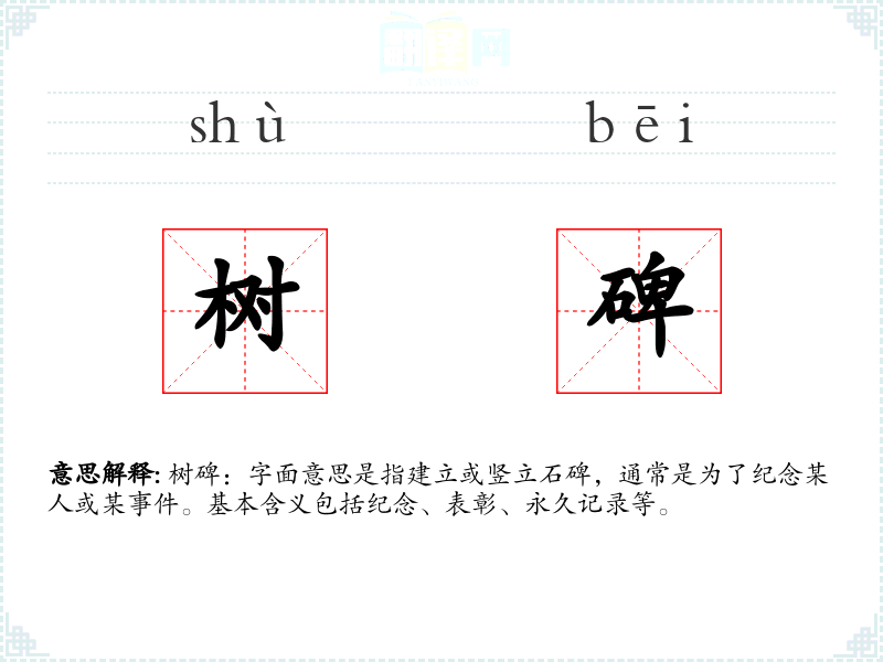 树碑:字面意思是指建立或竖立石碑,通常是为了纪念某人或某**。基本含义包括纪念、表彰、永久记录等。