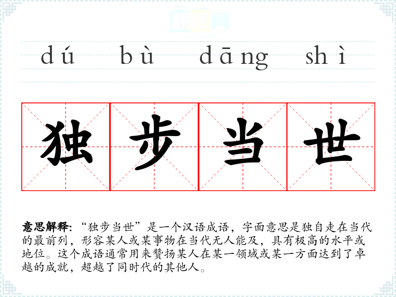 “独步当世”是一个汉语成语,字面意思是独自走在当代的最前列,形容某人或某事物在当代无人能及,具有极高的水平或地位。这个成语通常用来赞扬某人在某一领域或某一方面达到了卓越的成就,超越了同时代的其他人。