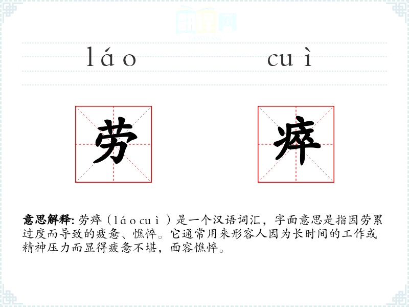 劳瘁(láo cuì)是一个汉语词汇,字面意思是指因劳累过度而导致的疲惫、憔悴。它通常用来形容人因为长时间的工作或精神压力而显得疲惫不堪,面容憔悴。