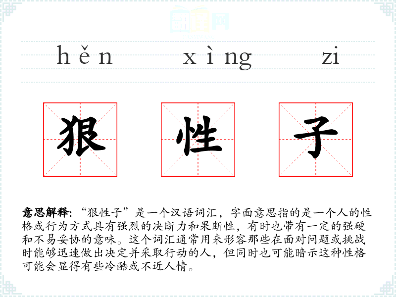 “狠性子”这个词汇的词源较为直接,其中“狠”字在古代汉语中就有强烈、凶猛的意思,而“性子”则是指一个人的性格或脾气。随着时间的推移,这个词汇的含义逐渐固定,用来形容那些性格强硬、决策果断的人。
