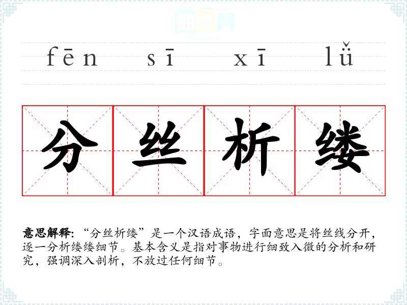 “分丝析缕”是一个汉语成语,字面意思是将丝线分开,逐一分析缕缕细节。基本含义是指对事物进行细致入微的分析和研究,强调深入剖析,不放过任何细节。