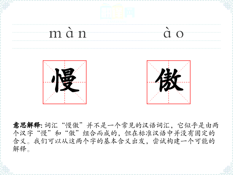 结合这两个字,我们可以推测“慢傲”可能指的是一种态度上的慢条斯理,同时带有一定的自傲或自尊。