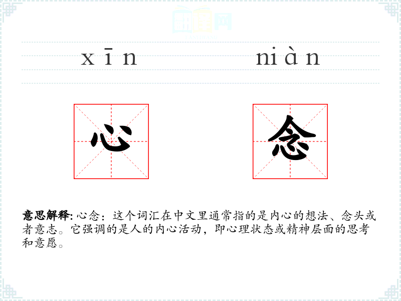 心念:这个词汇在中文里通常指的是内心的想法、念头或者意志。它强调的是人的内心活动,即心理状态或精神层面的思考和意愿。