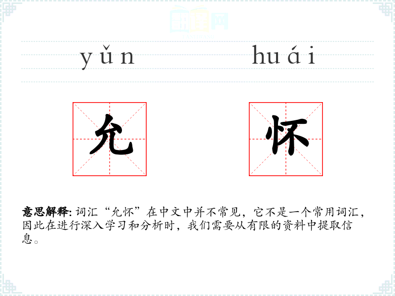 词汇“允怀”在中文中并不常见,它不是一个常用词汇,因此在进行深入学*和分析时,我们需要从有限的资料中提取信息。